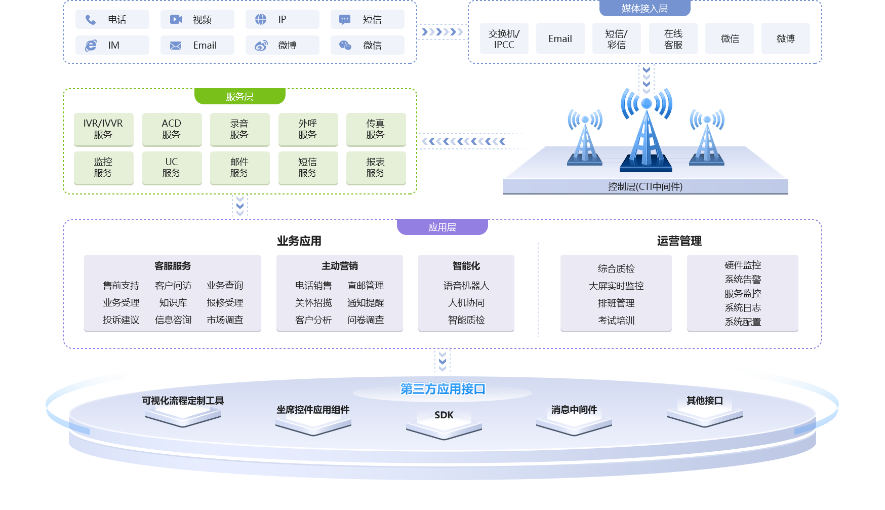 基于云计算技术的分布式呼叫中心平台,灵活部署可用环境;应对业务“峰谷”和话务量浪涌冲击